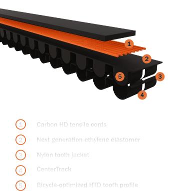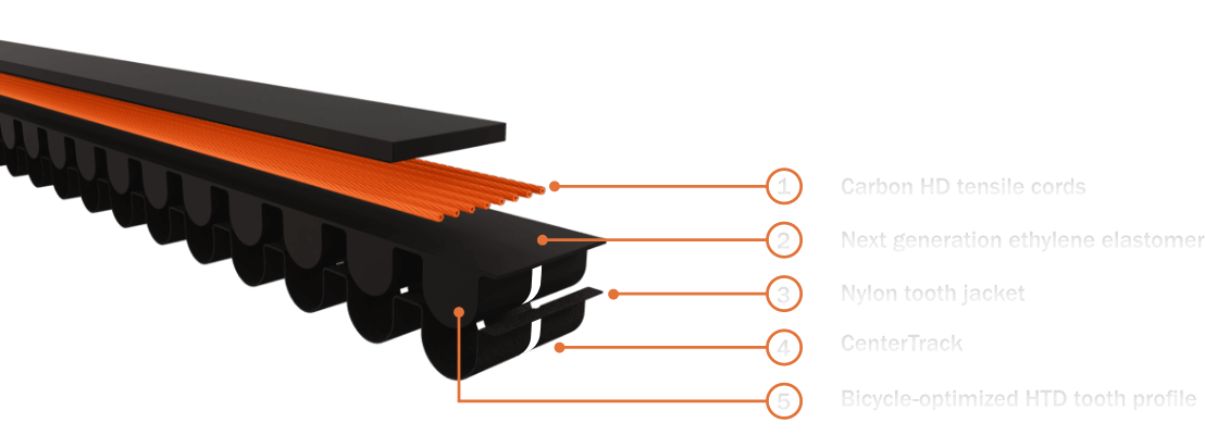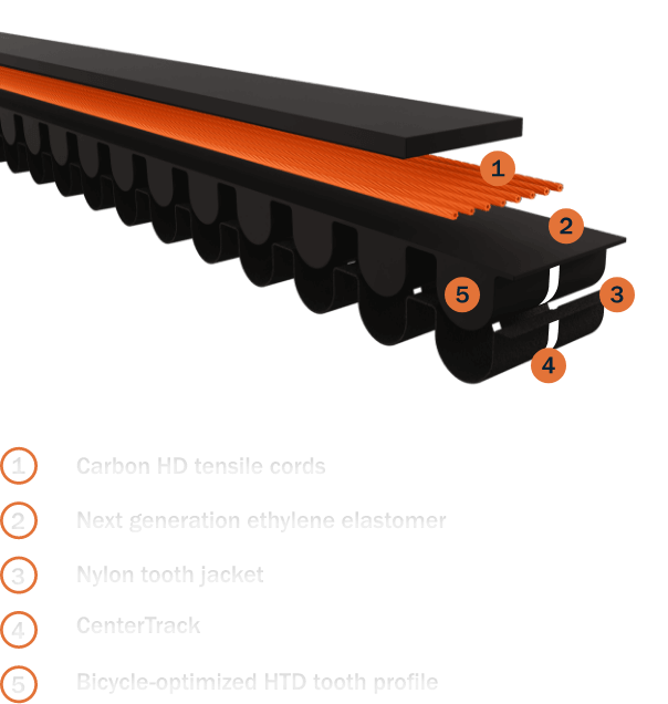 Closed, circumferential carbon fiber strands transmit drive power directly and without elastic stretch for maximum safety and efficiency. The patented tooth profile prevents the belt from skipping even when high force is applied.